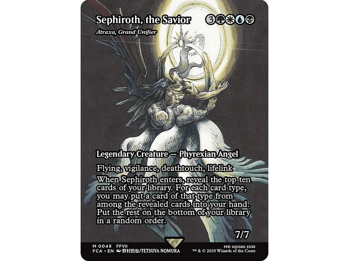 When Atraxa enters, reveal the top ten cards of your library. For each card type, you may put a card of that type from among the revealed cards into your hand. Put the rest on the bottom of your library in a random order. (Artifact, battle, creature, enchantment, instant, land, planeswalker, and sorcery are card types.)