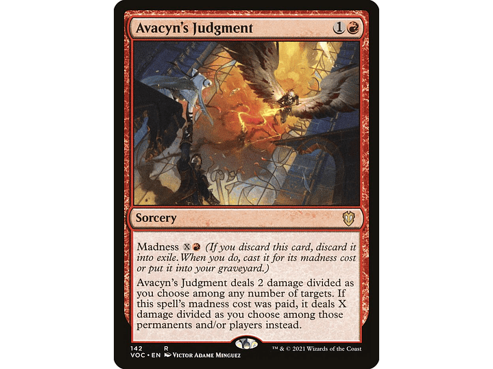 Avacyn's Judgment deals 2 damage divided as you choose among any number of targets. If this spell's madness cost was paid, it deals X damage divided as you choose among those permanents and/or players instead.