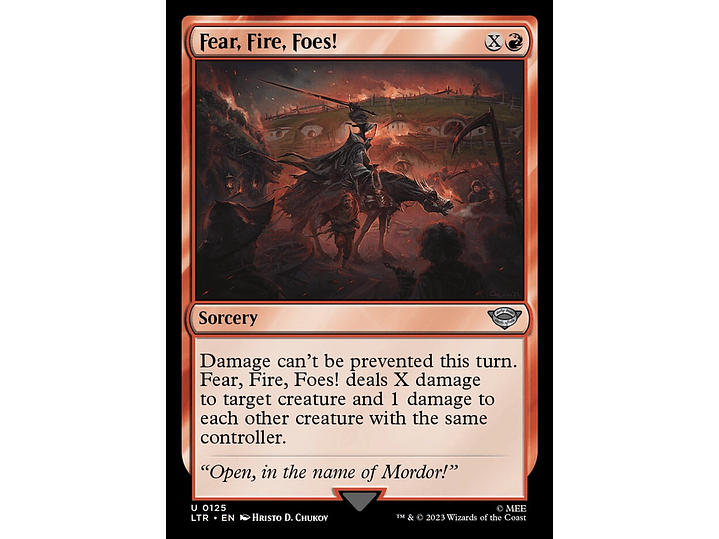 Damage can't be prevented this turn. Fear, Fire, Foes! deals X damage to target creature and 1 damage to each other creature with the same controller.