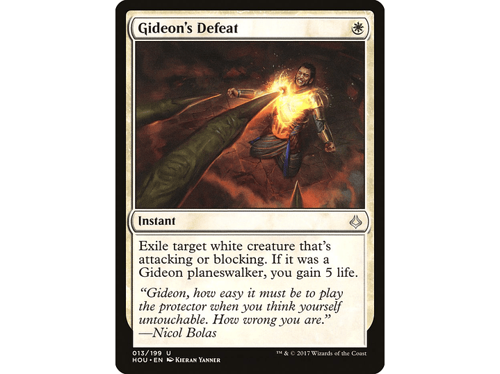 Exile target white creature that's attacking or blocking. If it was a Gideon planeswalker, you gain 5 life.