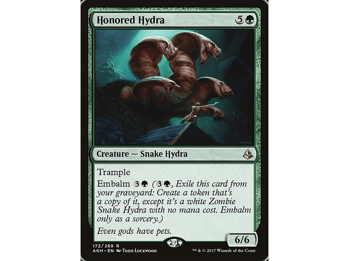 Embalm {3}{G} ({3}{G}, Exile this card from your graveyard: Create a token that's a copy of it, except it's a white Zombie Snake Hydra with no mana cost. Embalm only as a sorcery.)