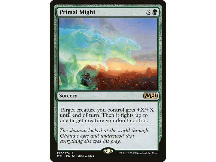Target creature you control gets +X/+X until end of turn. Then it fights up to one target creature you don't control. (Each deals damage equal to its power to the other.)