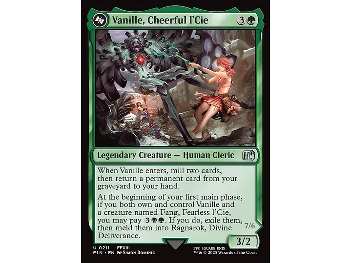 At the beginning of your first main phase, if you both own and control Vanille and a creature named Fang, Fearless l'Cie, you may pay {3}{B}{G}. If you do, exile them, then meld them into Ragnarok, Divine Deliverance.