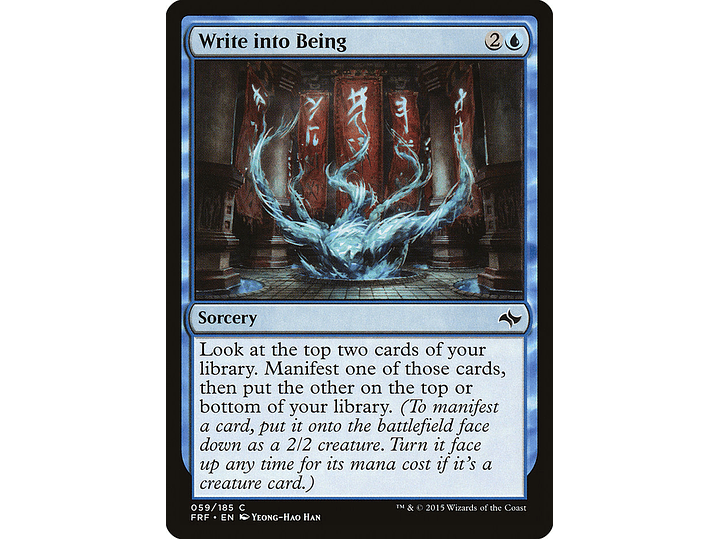 Look at the top two cards of your library. Manifest one of those cards, then put the other on the top or bottom of your library. (To manifest a card, put it onto the battlefield face down as a 2/2 creature. Turn it face up any time for its mana cost if it's a creature card.)